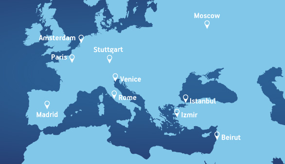 Venice, Paris, Amsterdam, Madrid, Rome, Istanbul, Beirut, Izmir, Moscow from/to Athens and Stuttgart from/to Thessaloniki.
