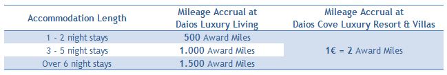 For stays at either Daios Hotel up until 31.07.2013, Members earn miles according to the ratio 1€ = 2 Award Miles.