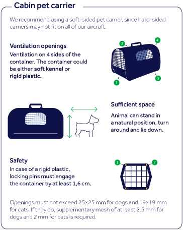 For the safe and comfortable travel of your pet in the cabin, we recommend using a soft-sided pet carrier. The space under the seat in front of you may vary depending on the aircraft type, and hard-sided carriers may not fit on all our aircraft.
